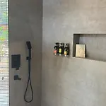A shower and a toilet, along with hair dryers and complimentary toiletries, are provided.